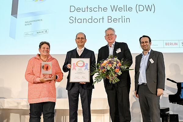 Sieger in der Kategorie „Inklusive Beschäftigung – Großunternehmen“ ist die Deutsche Welle in Berlin. Die Strategie der Unternehmensziele der Deutschen Welle fokussiert drei Schwerpunkte – People, Processes and Products. Zu dieser Unternehmenskultur bekennen sich am Berliner Standort 699 Arbeitnehmerinnen und Arbeitnehmer – 43 von ihnen haben eine Schwerbehinderung. Das entspricht einer Beschäftigungsquote von über 6%. Zahlreiche Inklusionsprogramme und Maßnahmen des Unternehmens fördern die berufliche Teilhabe von Menschen mit Beeinträchtigungen und ermöglichen zugleich Beschäftigten ohne Behinderung, einen Perspektivwechsel für mehr gelebte Inklusion.