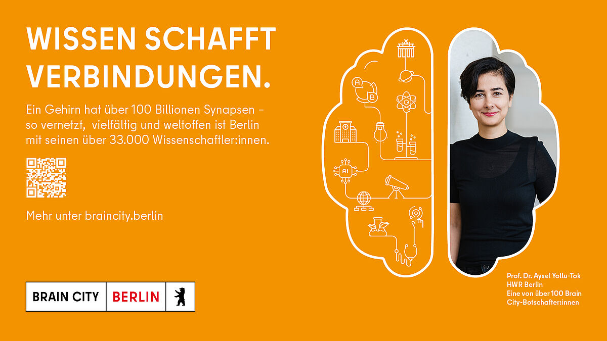 Grund genug, mit der Wissenschaftskampagne Brain City in diesem Monat mit drei neuen Plakatmotiven auf die Attraktivität und Strahlkraft der Berliner Wissenschaftslandschaft aufmerksam zu machen. Die Plakate, auf denen drei starke Headlines und passende Motive abgebildet sind, hängen ab Anfang November in der ganzen Stadt sowie an den Berliner Hochschulen. Mehr als 100 Brain City Botschafterinnen und Botschaftern  gibt es inzwischen. Eine von ihnen ist  Prof. Dr. Aysel Yollu-Tok, Professorin für Volkswirtschaftslehre an der Hochschule für Wirtschaft und Recht Berlin sowie Direktorin des Harriet Taylor-Mill-Instituts für Ökonomie und Geschlechterforschung. Unter dem Titel „Wissen schafft Verbindungen“ wird sie auf einem der Plakate zu sehen sein.