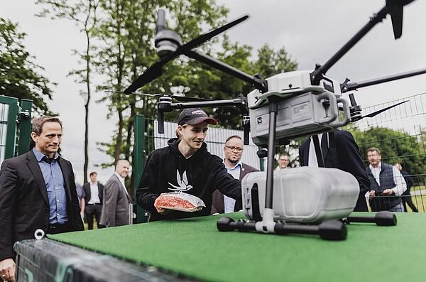 Doch nicht nur in der Luft, auch auf dem Boden der Realität sorgt die Drohne für Begeisterung: Knapp drei Viertel der Deutschen befürworten den Einsatz von Drohnen für die Nahversorgung im ländlichen Raum. Das Team von Luftlabor verfolgt auch deshalb nicht nur ein, sondern gleich mehrere Ziele. So sollen sowohl die Bewohnerinnen und Bewohner ländlicher Gebiete in ihrem Alltag entlastet als auch der lokale Einzelhandel unterstützt werden. Das Betriebskonzept wurde aus diesem Grund auch nicht nur für, sondern mit den Bürgerinnen und Bürgern vor Ort entwickelt – mit Erfolg. Geschäftsführer Tobias Biehle berichtet: „Die kaufmännischen, logistischen und technischen Aspekte greifen inzwischen gut ineinander, sodass wir einen zunehmend verlässlichen und attraktiven Service sicherstellen können.“