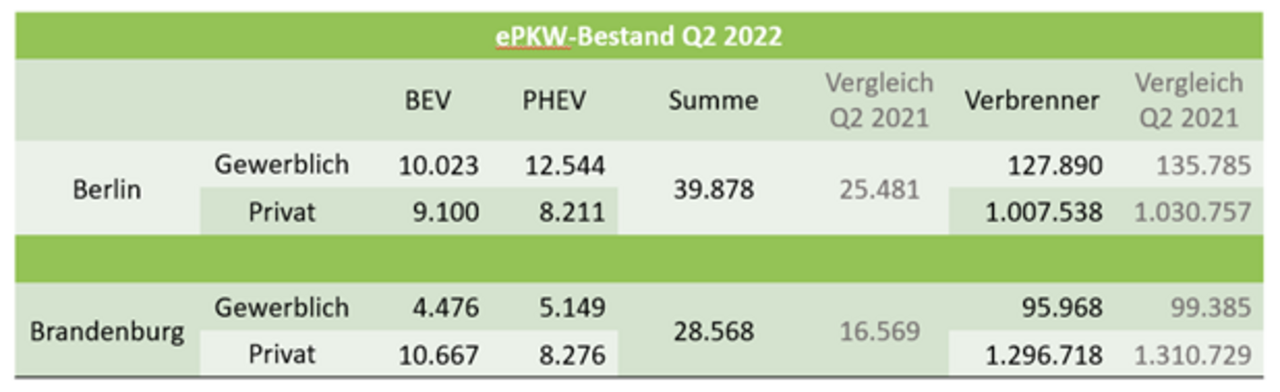 Trotz Produktionsengpässen und Lieferkettenproblemen steigt die Anzahl elektrischer Fahrzeuge in Berlin und Brandenburg weiter an. Laut aktuellen Zahlen (Stand 1.7.2022) des Kraftfahrtbundesamtes (KBA) sind 42.963 elektrische Fahrzeuge in Berlin und 29.906 elektrische Fahrzeuge in Brandenburg zugelassen.